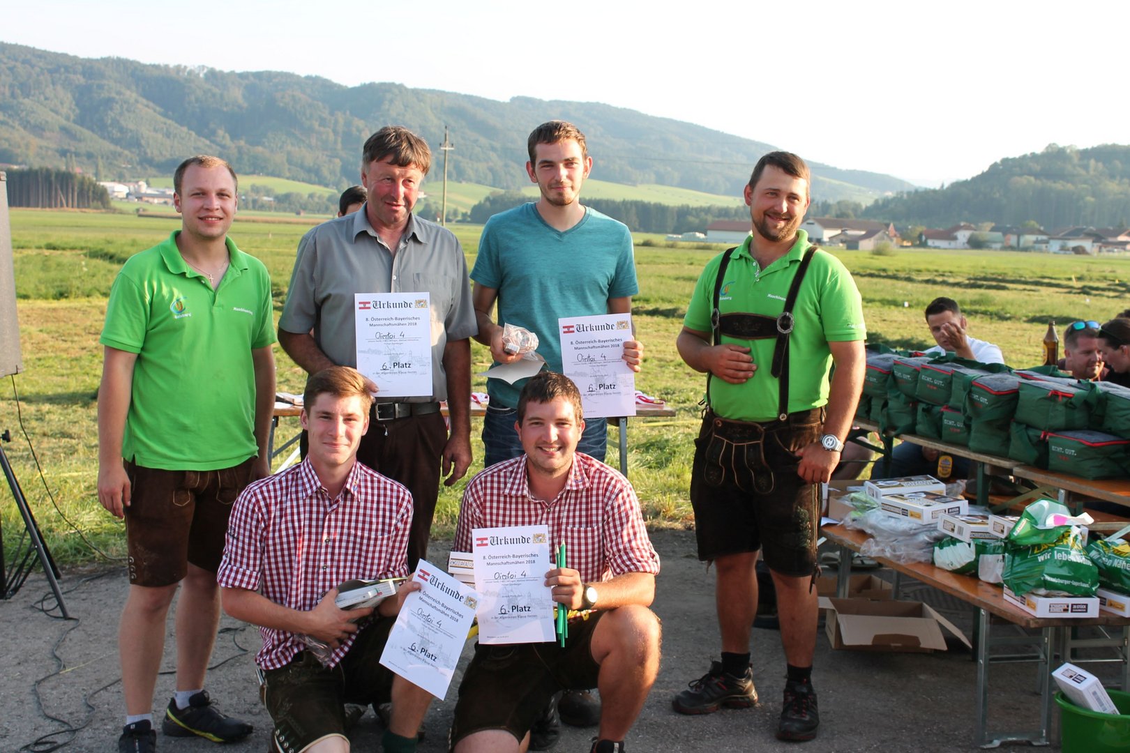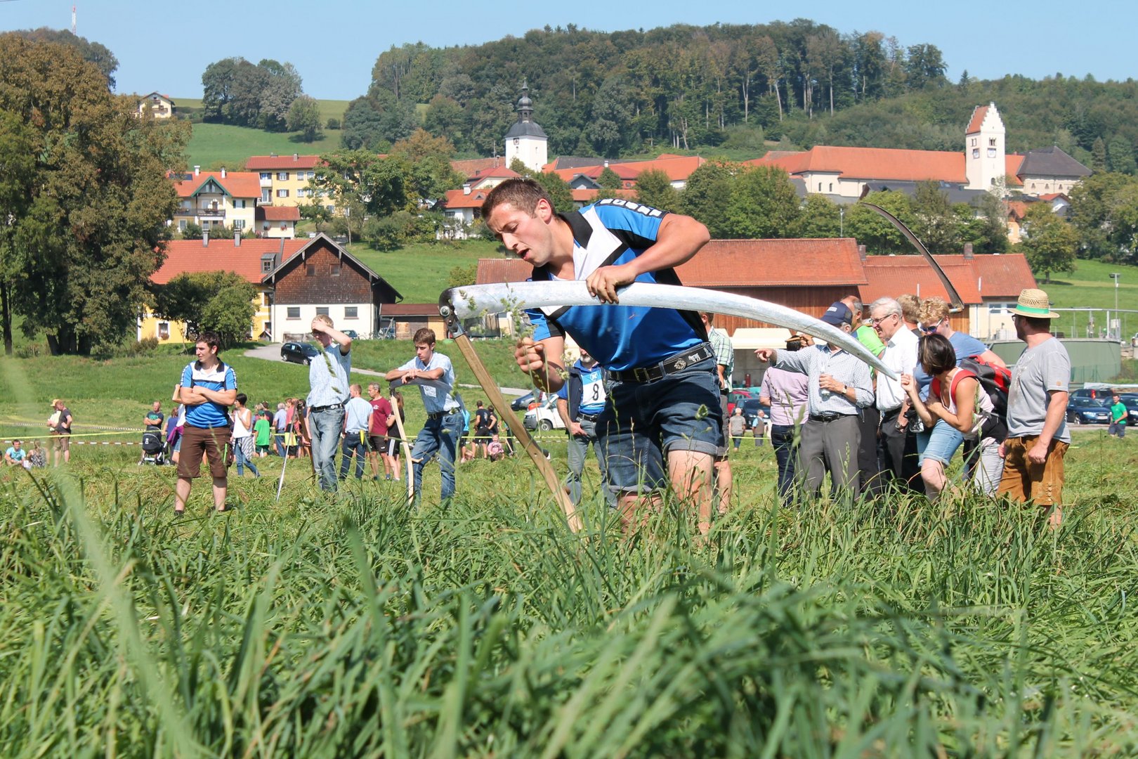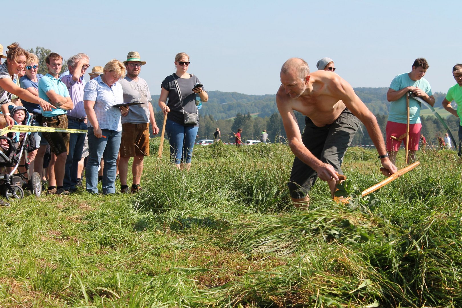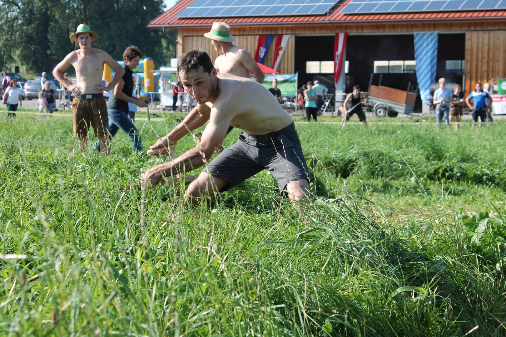 Am Sonntag, den 16. September 2018 fand das Österreich-Bayerische Mannschaftsmähen in Michaelbeuern statt. Über 160 TeilnehmerInnen aus der Schweiz, Slowenien, dem Baskenland, Südtirol und Österreich kämpften um den Meisterschaftstitel. Anders als bei den Landes- oder Bundesentscheiden der Landjugend wird beim Österreich-Bayerischen Mannschaftsmähen nicht einzeln sondern in 4er-Teams gestartet. In vier verschiedenen Kategorien kann teilgenommen werden. Die Königsklasse Herren (Sensenblattlänge über 90 cm) mäht dabei eine Fläche von 10 x 20 m und die Damen 8 x 15 m. In dieser Kategorie kommen Sensen bis zu 135 cm zum Einsatz. In der Allgemeinen Klasse (Sensenblattlänge unter 90 cm) sind Flächen von 8 x 15 m für die Herren und 6 x 10 m für die Damen zu mähen. „Auf ein gegebenes Signal beginnt der 1. Mäher der jeweiligen Mannschaft mit dem Mähen. Sobald dieser die entsprechende Markierung, die halbe Strecke der Parzellenlänge, mit der Sense erreicht hat, gibt ein zugeteilter Zeitnehmer ein deutliches Handzeichen zum Start für den zweiten Mäher der Mannschaft. Dies wiederholt sich auch bei dem dritten und vierten Mäher. Nachdem der letzte Mäher das Mähen beendet hat, wird das Ende durch ein Handzeichen angezeigt“, erklärt Teilnehmer und Organisator Matthias Huber (Landjugend Michaelbeuern) den Ablauf des Mannschaftsmähens. „Eine weitere Besonderheit des Wettbewerbes ist die Bewertung der Mahd. Diese muss gerade und gleichmäßig verlaufen. Ist die Mahd bewertet, wird das Mähgut entfernt und die Schiedsrichterkommission, bestehend aus vier Schiedsrichtern, bewertet dann die Sauberkeit“, erklärt Chef-Juror Andre Pertiller (Eugendorf) weiter.