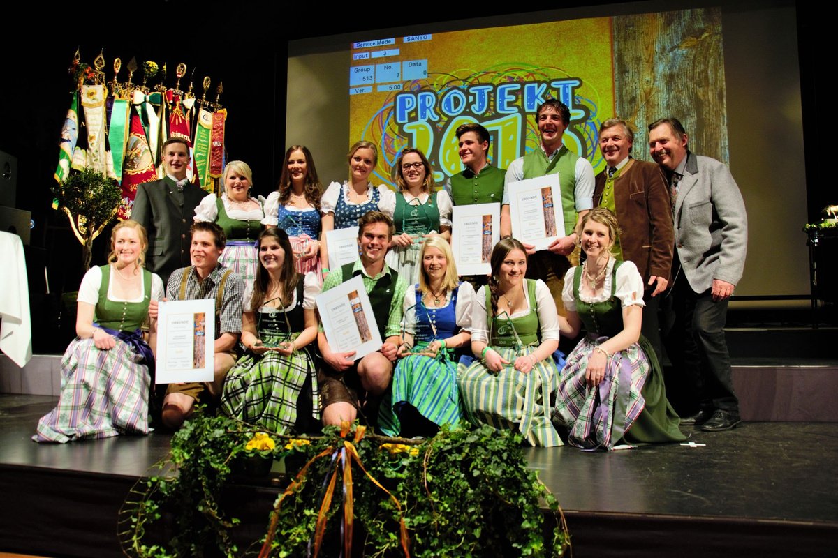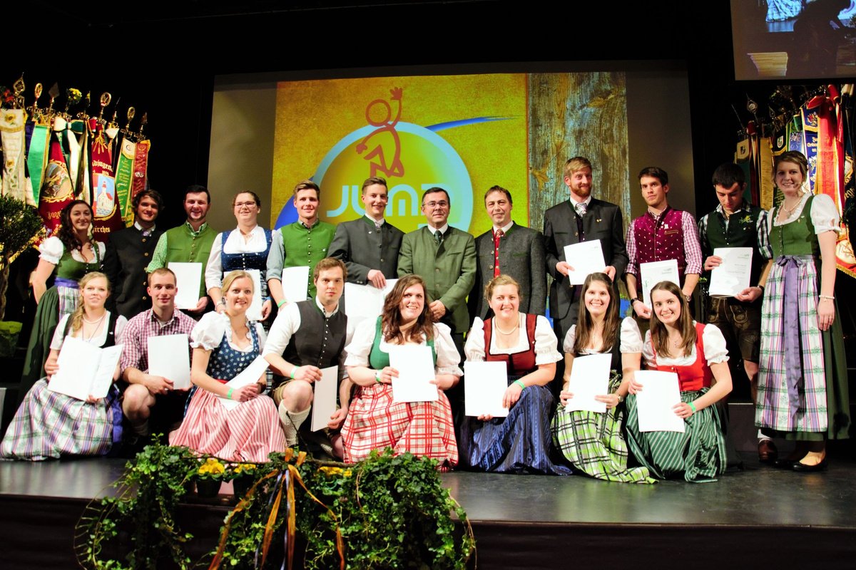 Ein weiterer Programmpunkt umfasste die Auszeichnung der JUMP-Absolventen. „JUMP“ ist der LFI-Zertifikatslehrgang der Landjugend Salzburg und steht für „Junge, unschlagbar motivierte Persönlichkeiten“. Auf vier Module aufgebaut, umfasst der Lehrgang JUMP 83 Unterrichtseinheiten und beschäftigt sich mit Rhetorik und Teambildung, mit Projektmanagement, Öffentlichkeitsarbeit und Veranstaltungsplanung. Die gelernten Fähigkeiten werden anschließend bei der Planung und Durchführung eines eigenen Projektes angewandt und gefestigt. Den Abschluss bildet die Projektpräsentation, bei der die TeilnehmerInnen ihr Projekt einer Jury präsentieren. Jump-Absolventen Manfred Graggaber (LJ Unternberg), Christoph Santner (LJ Unternberg), Claudia Graggaber (LJ Unternberg), Elisabeth Weilbuchner, Fabian Prudky (LJ Göming), Paul Schreilechner (LJ Mariapfarr-Weißpriach), Katharina Hallinger (LJ Bischofshofen), Maximilian Brugger (LJ Lessach), Theresa Gschwandtner (LJ Pfarrwerfen), Julia Peßenteiner (LJ Saalfelden), Sabrina Laner (LJ Bramberg), Margit Steiner (LJ Piesendorf), Veronika Riedlsberger (LJ Mittersill-Hollersbach), Martin Listberger (LJ Enns-Pongau), Christine Gruber (LJ Uttendorf), Roman Egger (LJ Piesendorf), Viktoria Schneider (LJ Maishofen), Bernhard Imlauer (LJ Saalfelden).