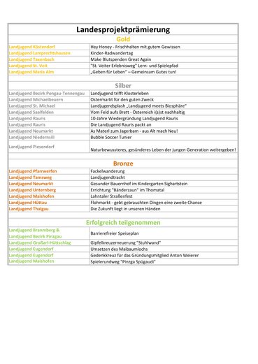 Erfolge 2019 Großartige Erfolge konnten im letzten Jahr auf Bundesebene verbucht werden. Landesobmann Markus Aigner holte am Bundesentscheid Reden in Matrei, Osttirol in der Kategorie Spontanrede den 2. Stockerlplatz nach Salzburg. Einen besonderen und mit viel Ehrgeiz erkämpften Titel verteidigte Elisabeth Schilcher (Köstendorf) – sie kürte sich bei der Heim-EM im Handmähen in Oberösterreich zur Vize-Europameisterin. Auch Matthias Huber (Michaelbeuern) und Franz Erbschwendtner (St. Georgen) erzielten hervorragende Leistungen. Landesprojektprämierung Mit 26 Projekten und über 11.000 ehrenamtlichen Stunden zeigten Salzburgs Jugendliche eine beeindruckende Performance. Fünf Projekte wurden in der Kategorie Gold ausgezeichnet. Zu den Gewinnern in dieser Kategorie zählen die Landjugendgruppen Lamprechtshausen mit dem Projekt „Kinder-Radwandertag“. „Make Blutspenden Great Again“ der Landjugend Taxenbach sowie der Landjugend St. Veit mit dem Projekt „"St. Veiter Erlebnisweg" Lern- und Spielepfad“. Die Landjugend Maria Alm glänzte mit dem Projekt „ ‚Geben für Leben‘ – Gemeinsam Gutes tun!“. Die Landjugend Köstendorf erreichte mit ihrem Projekt „Hey Honey - Frischhalten mit gutem Gewissen“ nicht nur die Auszeichnung in Gold, sondern wurde auch als bestes Landesprojekt gekürt.