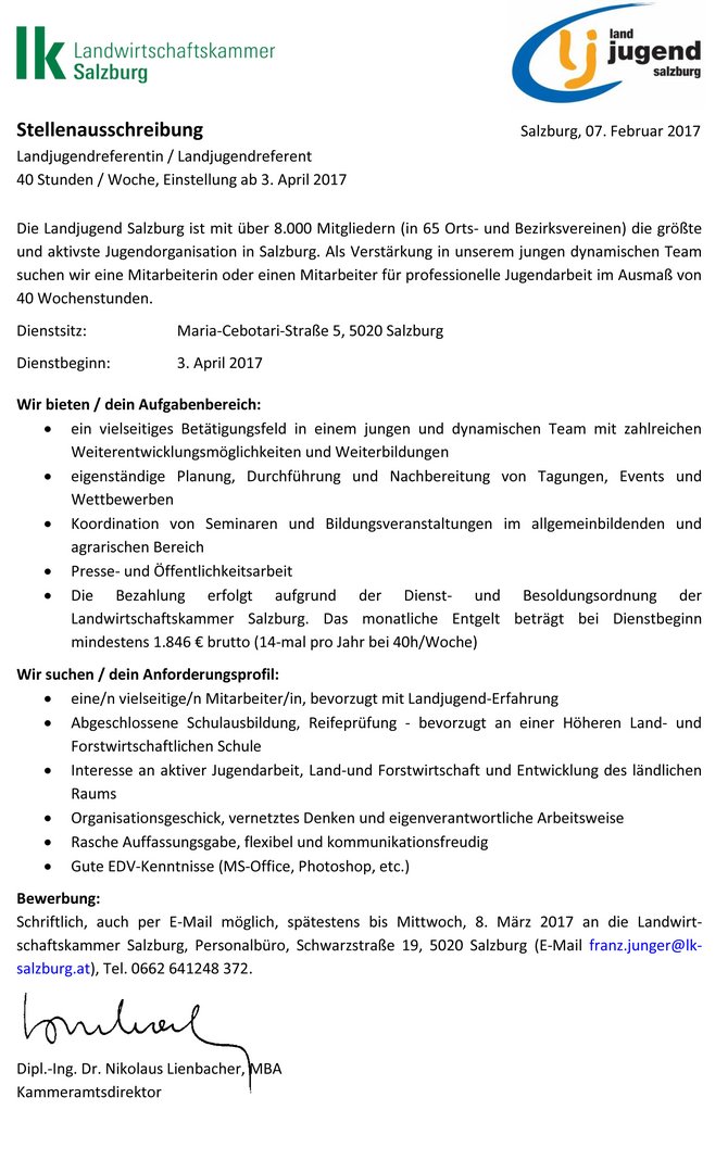 Schriftlich, auch per E-Mail möglich, spätestens bis Mittwoch, 8. März 2017 an die Landwirtschaftskammer Salzburg, Personalbüro, Schwarzstraße 19, 5020 Salzburg (E-Mail franz.junger(at)lk-salzburg.at), Tel. 0662 641248 372