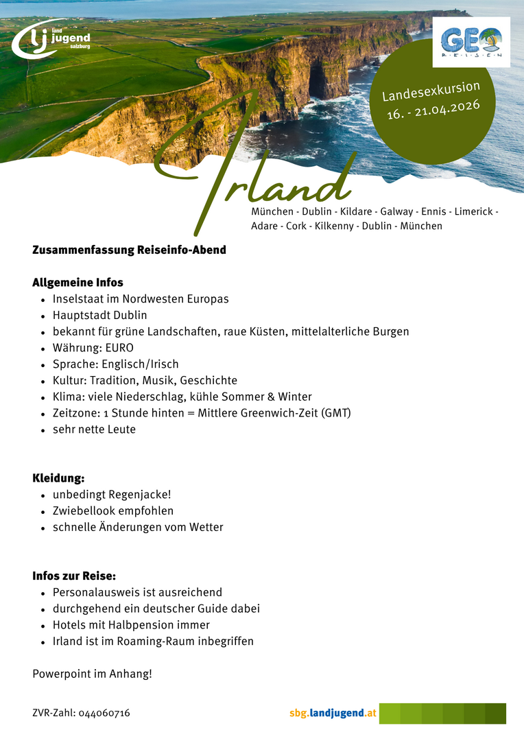 Grüne Hügel, wilde Küsten und echte Landwirtschaftstradition warten auf dich. Erlebe Irland hautnah: moderne Betriebe besuchen, mit jungen Landwirt:innen vor Ort ins Gespräch kommen und gemeinsam die Kultur entdecken. Und klar – ein frisch gezapftes Guinness im Pub darf auch nicht fehlen. Diese Reise verbindet spannende Einblicke in die Landwirtschaft mit irischer Lebensfreude und garantiert jede Menge Spaß in der Gruppe.